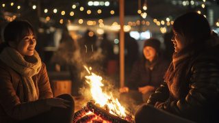 夜の都会で、キャンプファイヤをする女子 東京都 町田市 ストリートスナップ