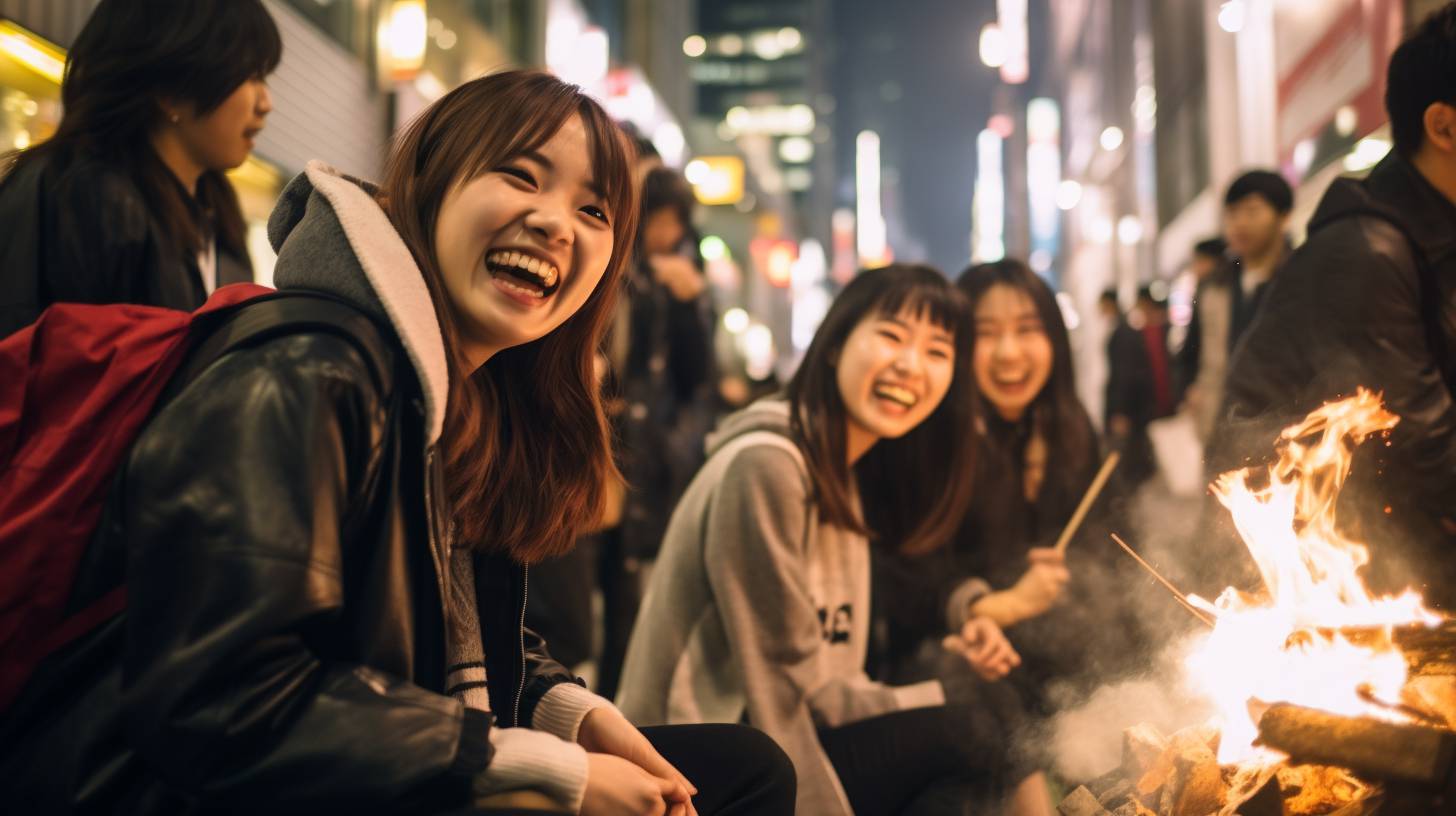 夜の都会で、キャンプファイヤをする女子 宮城県 大崎市 ストリートスナップ