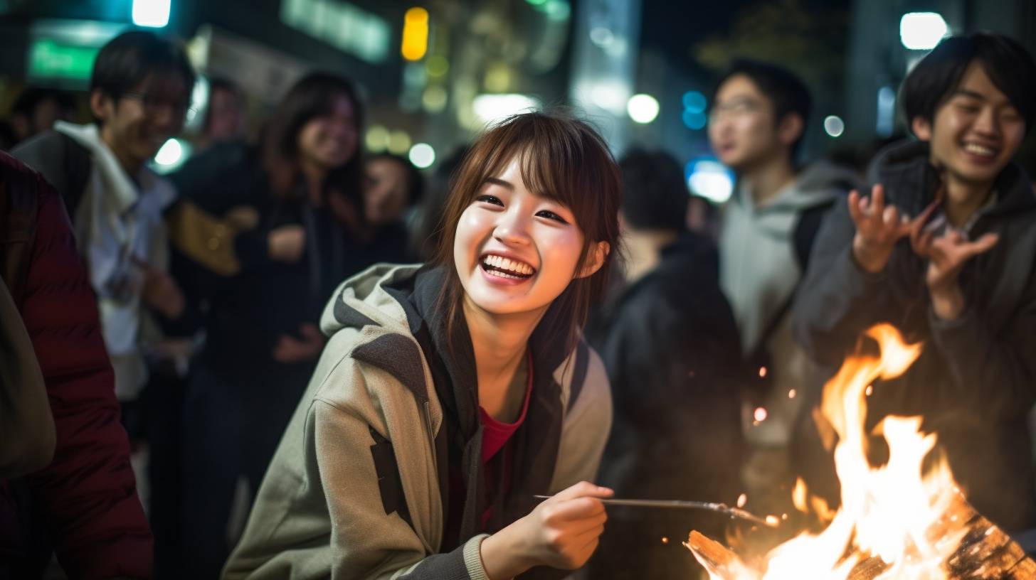 夜の都会で、キャンプファイヤをする女子 熊本県 天草市 ストリートスナップ