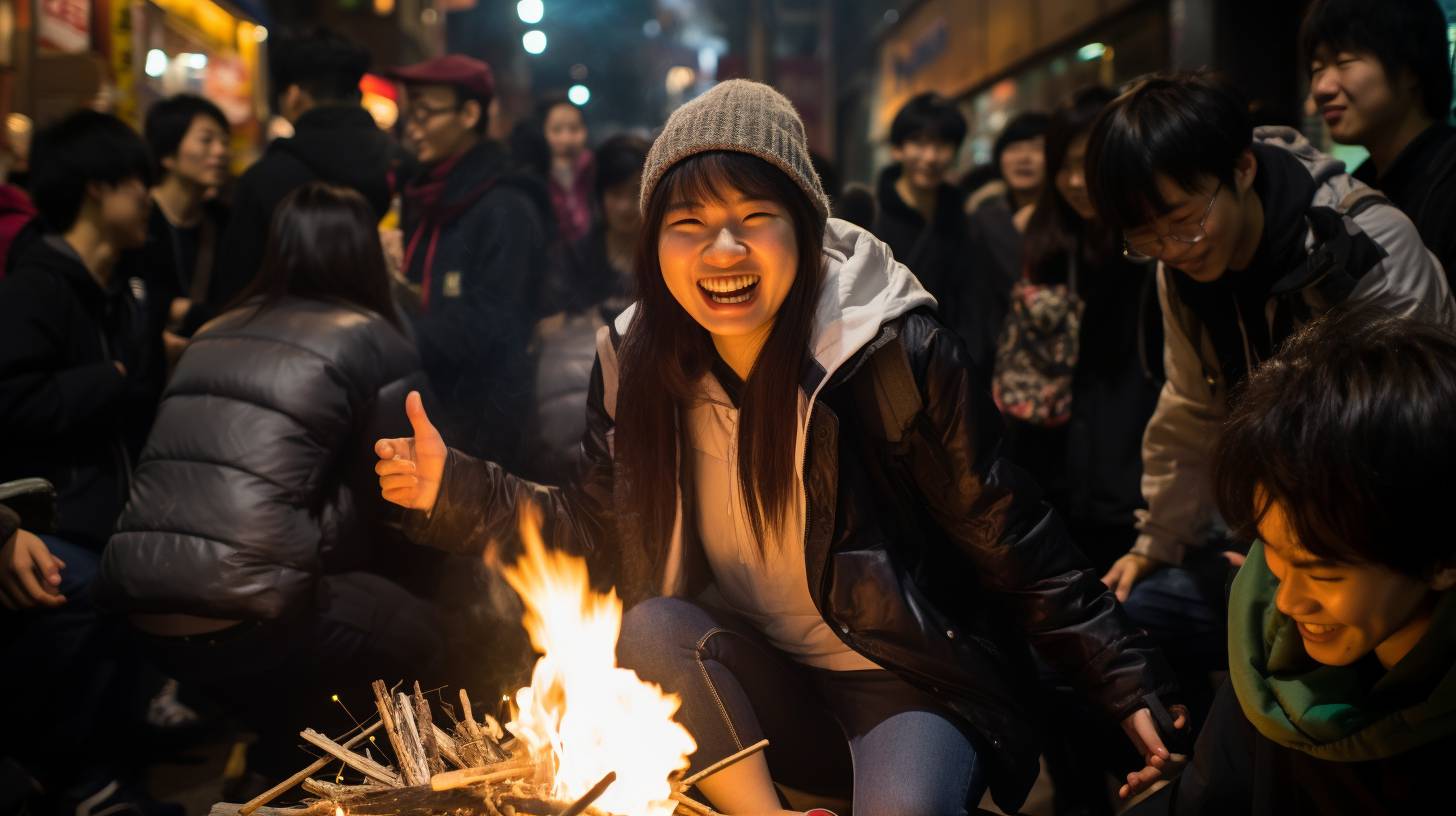 夜の都会で、キャンプファイヤをする女子 愛知県 津島市 ストリートスナップ