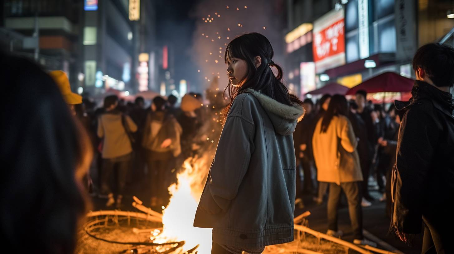 夜の都会で、キャンプファイヤをする女子 東京都 西東京市 ストリートスナップ