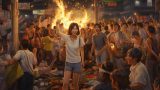 夜の都会で、キャンプファイヤをする女子 大阪府 泉佐野市 ストリートスナップ