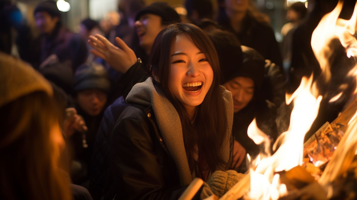 夜の都会で、キャンプファイヤをする女子 東京都 中央区 ストリートスナップ