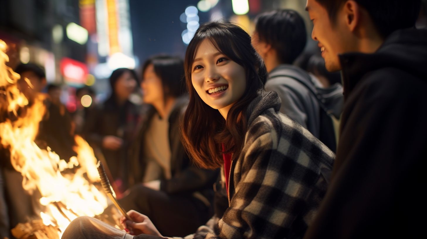 夜の都会で、キャンプファイヤをする女子 静岡県 磐田市 ストリートスナップ