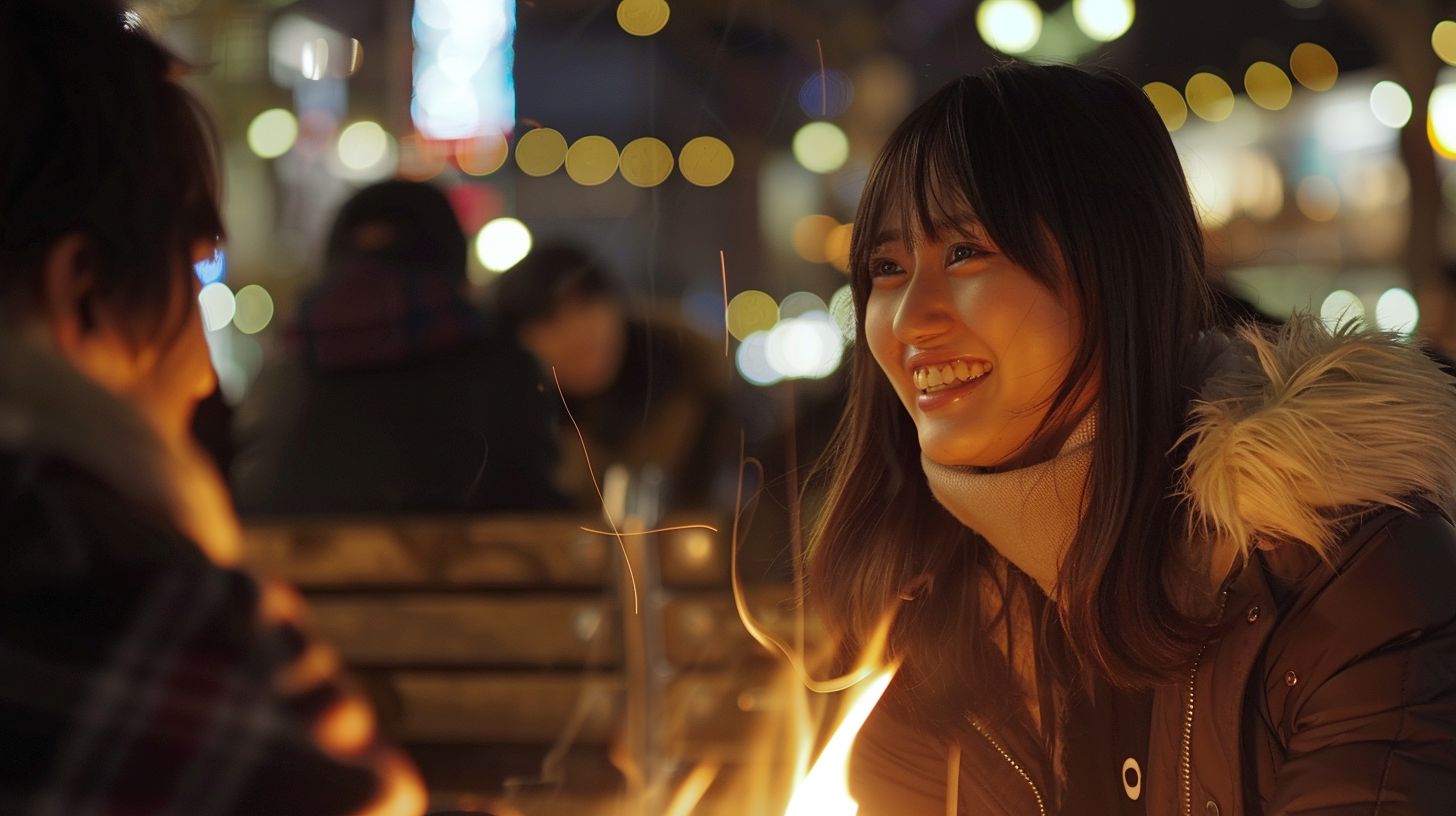 夜の都会で、キャンプファイヤをする女子 青森県 十和田市 ストリートスナップ