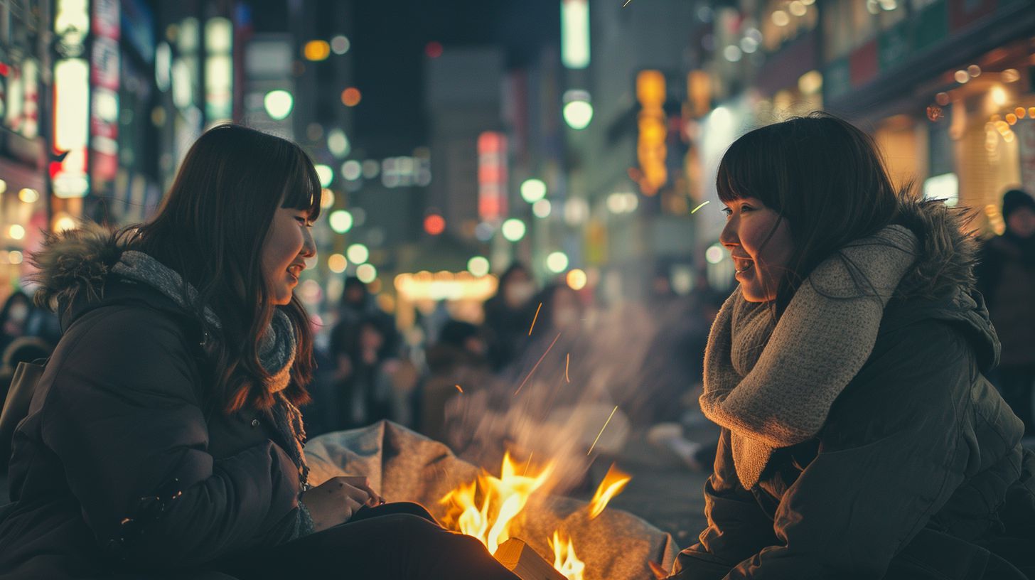 夜の都会で、キャンプファイヤをする女子 埼玉県 志木市 ストリートスナップ