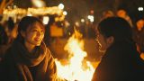 夜の都会で、キャンプファイヤをする女子 東京都 多摩市 ストリートスナップ