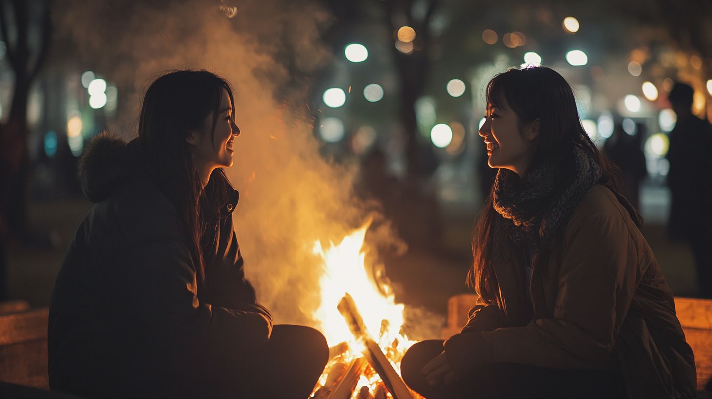 夜の都会で、キャンプファイヤをする女子 宮崎県 都城市 ストリートスナップ