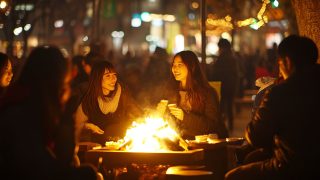 夜の都会で、キャンプファイヤをする女子 長野県 安曇野市 ストリートスナップ