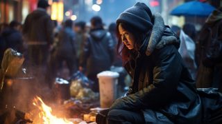 夜の都会で、キャンプファイヤをする女子 大阪府 池田市 ストリートスナップ